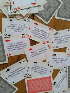 Eventueel bereid je wat vragen voor. Ik organiseerde dit voorjaar een bijeenkomst voor tekstschrijvers en maakte van speelkaarten en stickers wat vragenkaarten met gespreksonderwerpen:
