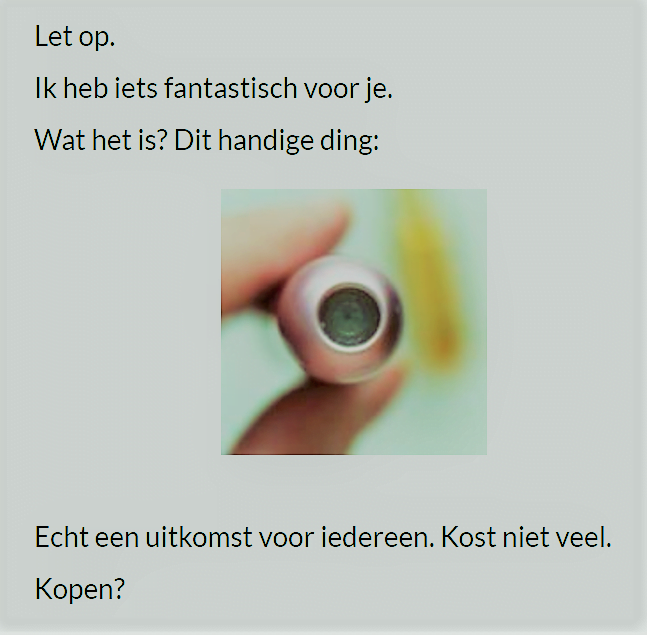 Een goed voorbeeld van een slechte verkooptekst, dát is het. Roept alleen maar vragen op en geeft geen antwoorden.